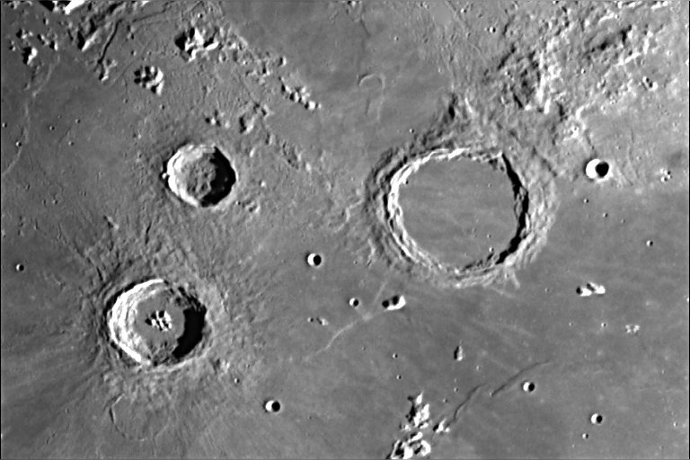 The craters Ptolemaeus (bottom), Alphonsus (center) and Arzachel (top) at