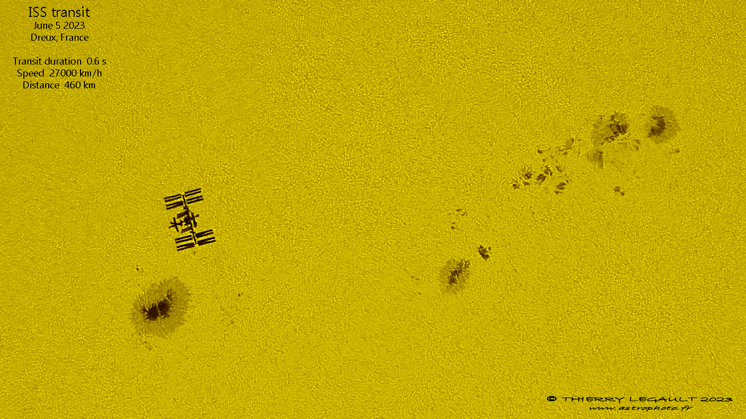 The ISS passed in front of 3 sunspots groups! Using real time images of the Sun, I estimated the position of the main sunspot groups towards vertical and horizontal directions (which depends on time and location), I compared it to the trajectory planned by www.transit-finder.com, and I tried to place myself on the corresponding transit line (which was not the center of the transit visibility path).